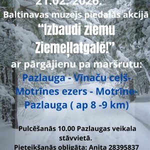 Maršruts Pazlauga – Motrīnes ezers – vecais Motrīnes ceļš – Pazlauga (9 km). Pie Motrīnes ezera baudīsim siltu zupu! Pārgājienu organizē Baltinavas muzejs un gida lomā – Anita Ločmele. Dalības maksa 5 €. Ģērbies atbilstoši laikapstākļiem un iešanai arī pa bezceļiem! Iepriekšējā pieteikšanās obligāta: 28395837.