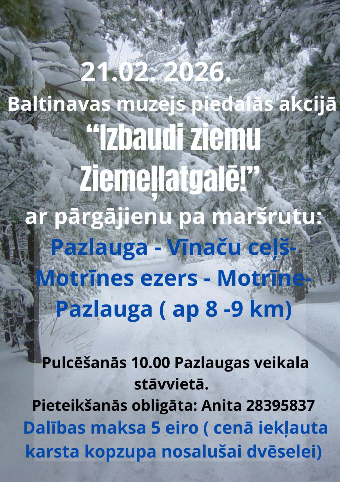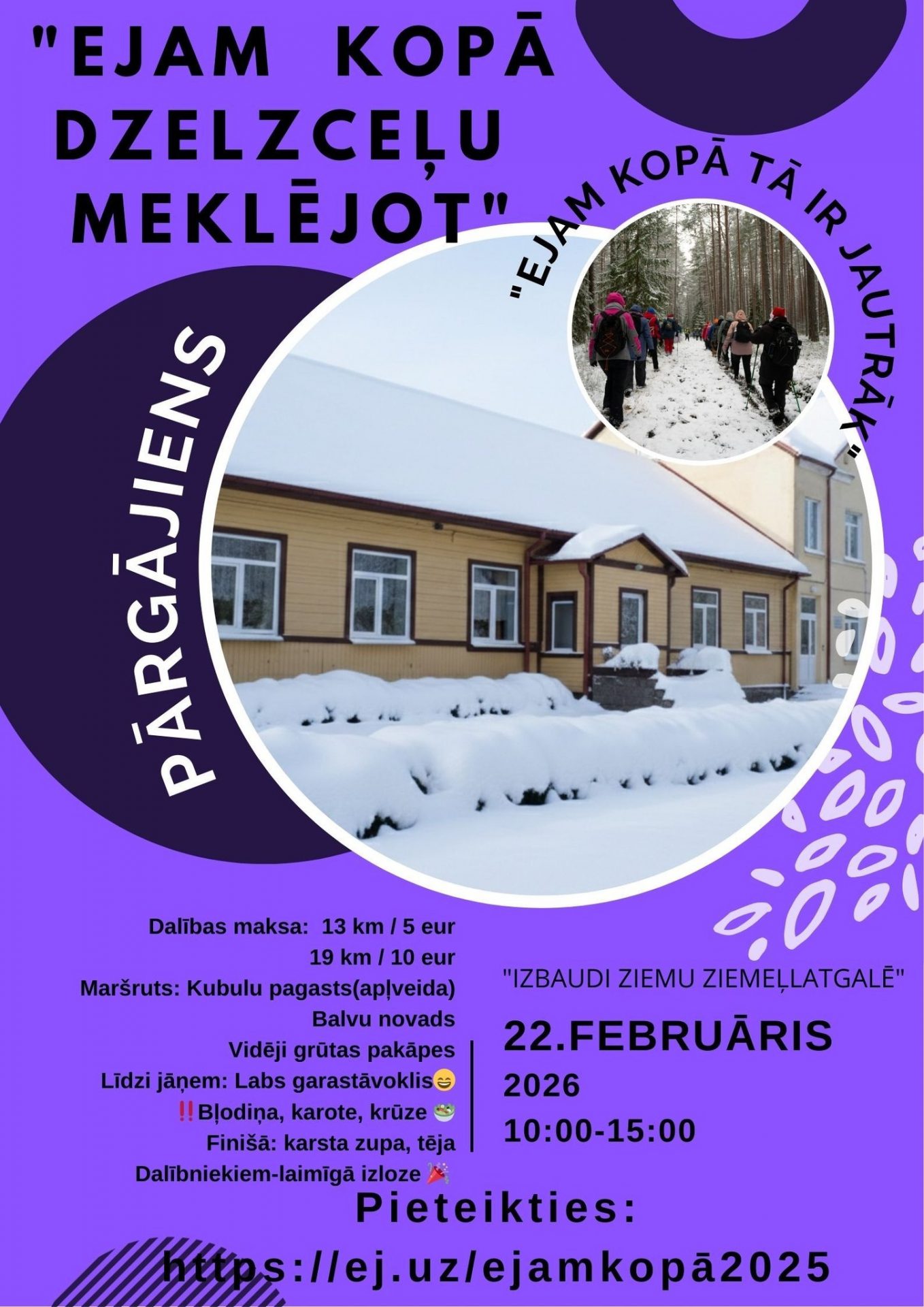 Ģērbies atbilstoši laikapstākļiem, līdzi ņem uzkodas enerģijai un silta tēju! Finišā – visiem dalībniekiem silta zupa, karsts dzēriens un balvu izloze!