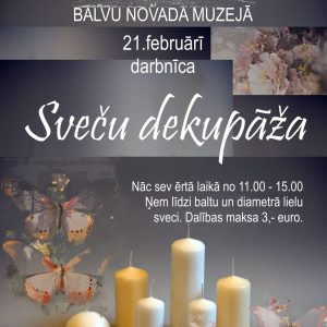 Keramiķes Lības Ločmeles porcelāna trauku izstāde ”Pieskarties”. Sveču dekupāžas darbnīca. Dalības maksa 3 €un līdzi jāņem sava svece (vēlams balta).
