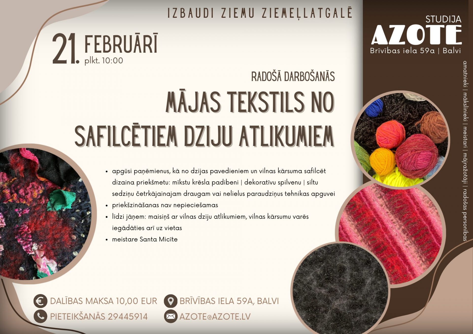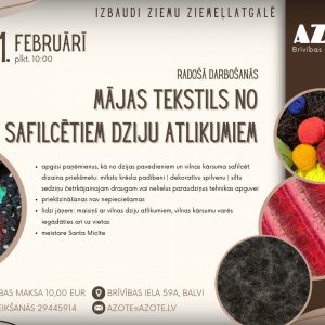 21.februārī 10:00 Radošā darbošanās “Mājas tekstils no safilcētiem dziju atlikumiem”. Katrai rokdarbniecei uz galvošanu ir vismaz viena ‘labo nodomu kaste’ ar dažādiem dziju atlikumiem, kurus gadiem nekādi nesanāk realizēt jaunā rokdarbā, bet izmest neceļas roka. Azotei ir lieliska ideja, kā ātri atbrīvot ‘labās nodomu kastes’ enerģiju un transformēt aizmirstos kamolus derīgā dizaina priekšmetā. Meistardarbnīcā apgūsi paņēmienus, kā no dzijas pavedieniem un vilnas kārsuma safilcēt dizaina priekšmetu: mīkstu krēsla padibeni, dekoratīvu spilvenu, siltu sedziņu četrkājainajam draugam vai nelielus paraudziņus tehnikas apguvei. Priekšzināšanas nav nepieciešamas. Meistare – Santa Micīte.