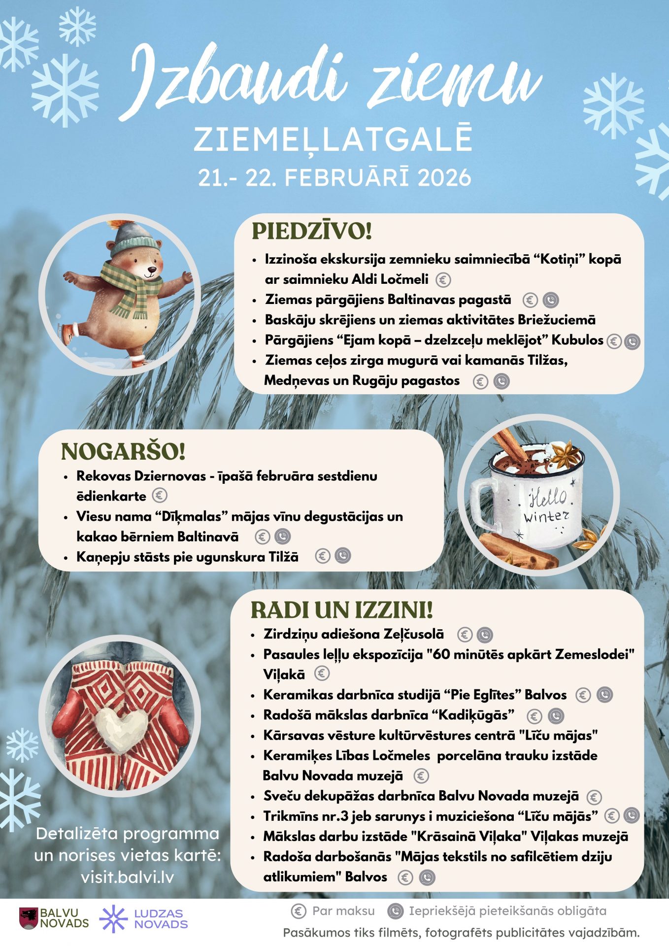 21.un 22.februārī aicinām ieplānot piedzīvojumiem, sajūtām un garšām piepildītu ziemas nedēļas nogali tradicionālajā brīvdienu piedāvājumā visai ģimenei “Izbaudi ziemu Ziemeļlatgalē 2026” , kas norisināsies Balvu novadā un Ludzas novada Kārsavā.