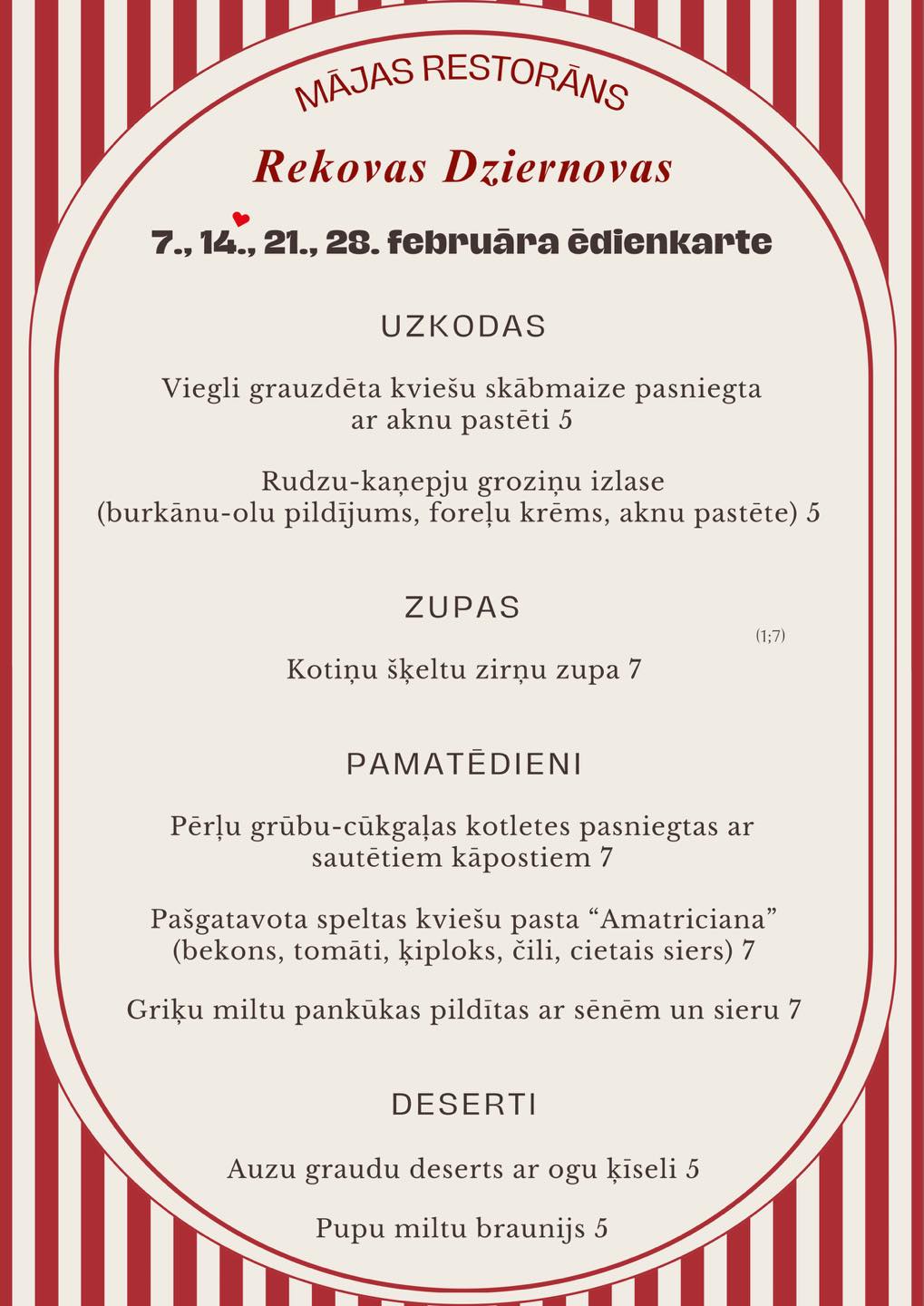 Īpašā februāra sestdienu ēdienkarte.