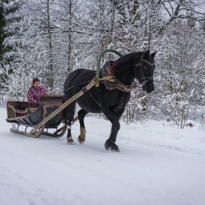 Izbaudi ziemas skaistumu zirga kamanās! Dažādā zirgu Inventāra apskate, zirgu cienāšana ar gardumiem (burkāni, āboli). Tikai atbilstošos laikapstākļos! Piedāvājuma cena sākot no 30€/h.