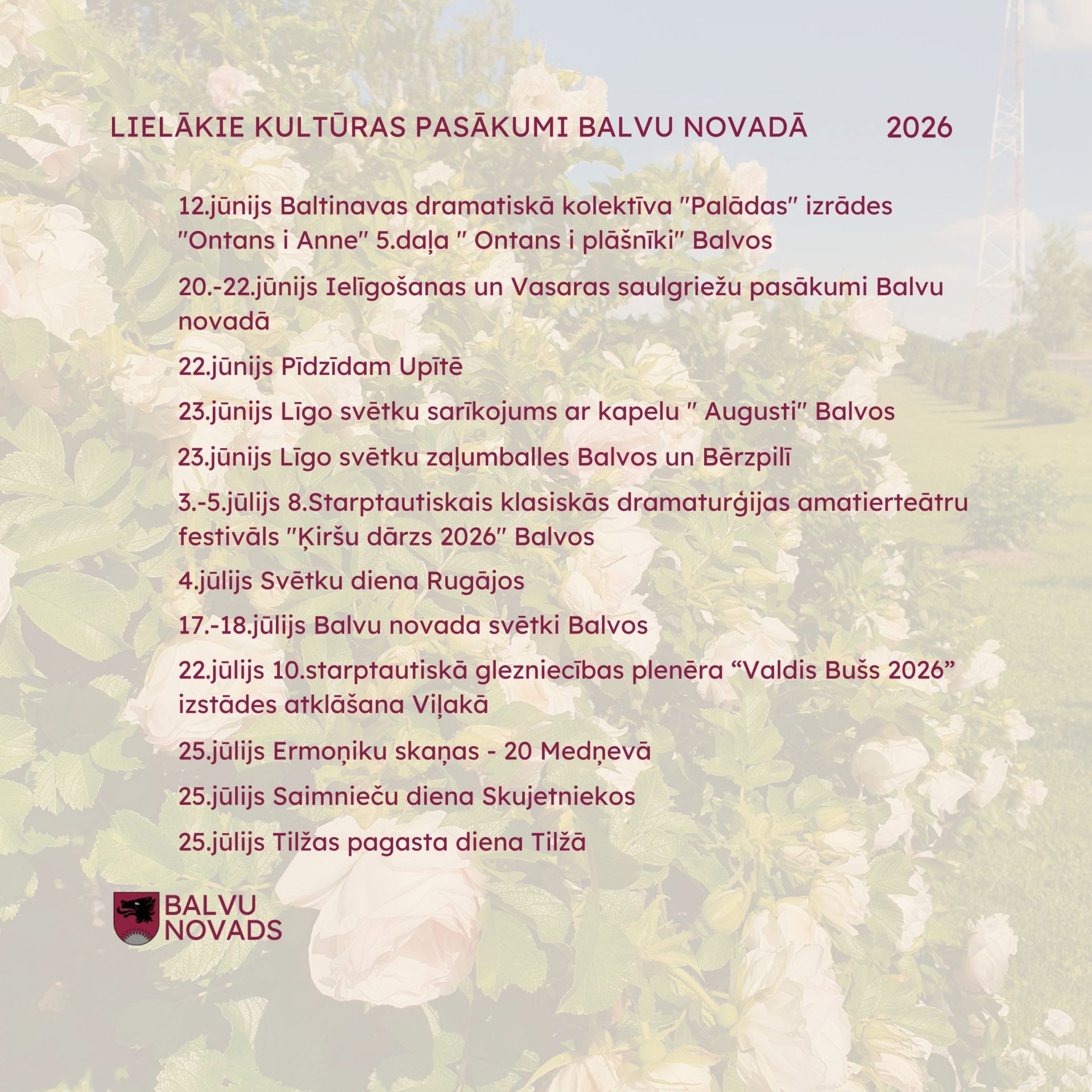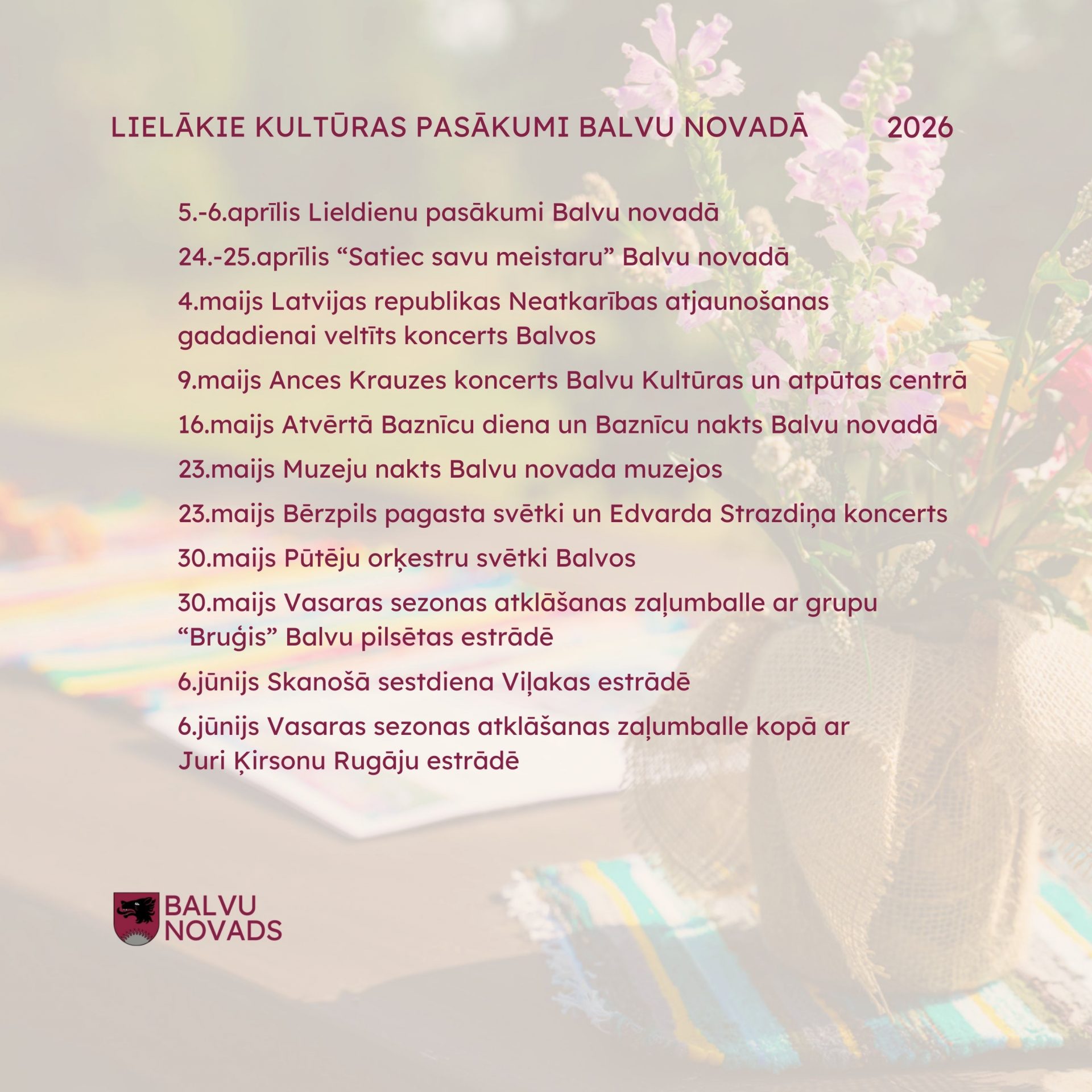 Informācija par visiem kultūras pasākumiem un norisēm Balvu novadā: https://www.balvi.lv/lv