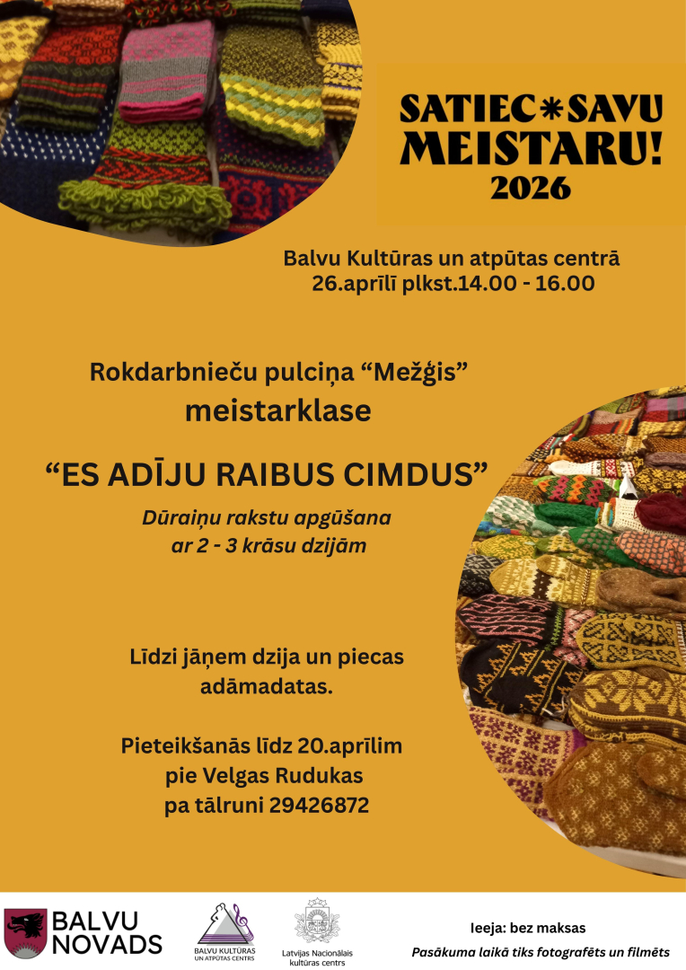 26.aprīlis 14:00-16:00 Balvu Kultūras un atpūtas centra rokdarbnieču pulciņa “Mežģis” meistarklase “Es adīju raibus cimdus” Balvos