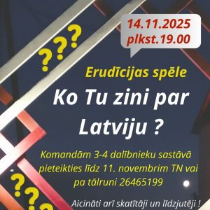 19:00 Erudīcijas spēle “Ko Tu zini par Latviju?” Naudaskalna Tautas namā. Komandu (3-4 pers.) pieteikšana līdz 11.11., zvanot 26465199.