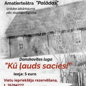 16:11  Amatierteātra ”Palādas” izrāde ”Kū ļauds sacies”, režisore Anita Ločmele, Baltinavas Kultūras namā. Ieejas maksa: 5 EUR. Vietu rezervēšana, zvanot 26394227 (Violenta).