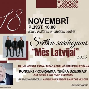 16:00 Svētku sarīkojums “Mēs Latvijai” Balvu Kultūras un atpūtas centrā – Balvu novada pašvaldības apbalvojumu pasniegšana, Ata Ieviņa un “The Rock brothers” koncertprogramma “Spēka dziesmas”. Pasākuma vadītājs – aktieris un režisors Mārtiņš Vilsons. Ieeja bezmaksas.