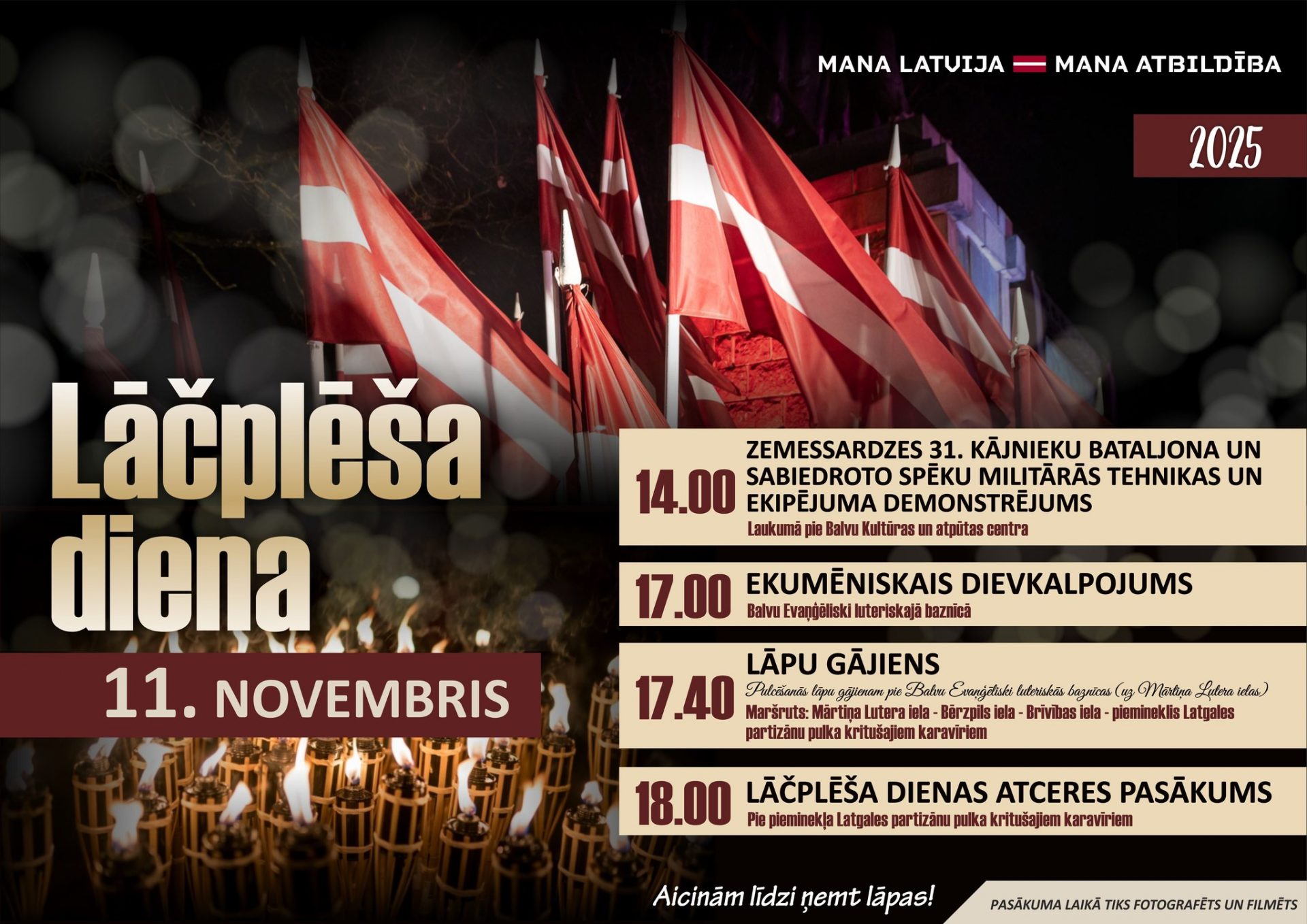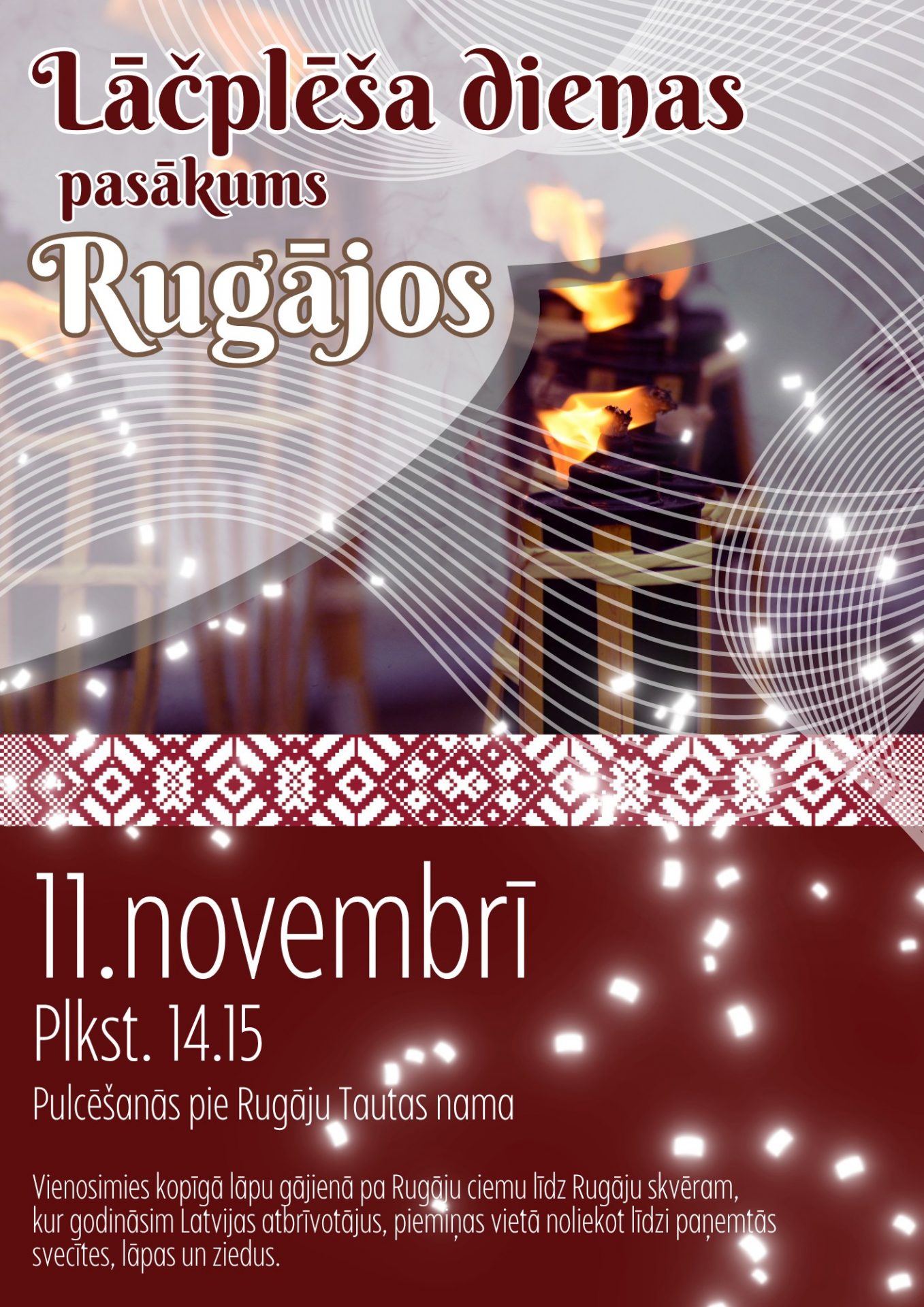 14:15 Lāčplēša dienas pasākums Rugājos – lāpu gājiens līdz Rugāju skvēram, kur piemiņas vietā godināsim Latvijas atbrīvotājus (pulcēšanās pie Rugāju Tautas nama; līdzi ņemiet svecītes, lāpas, ziedus)