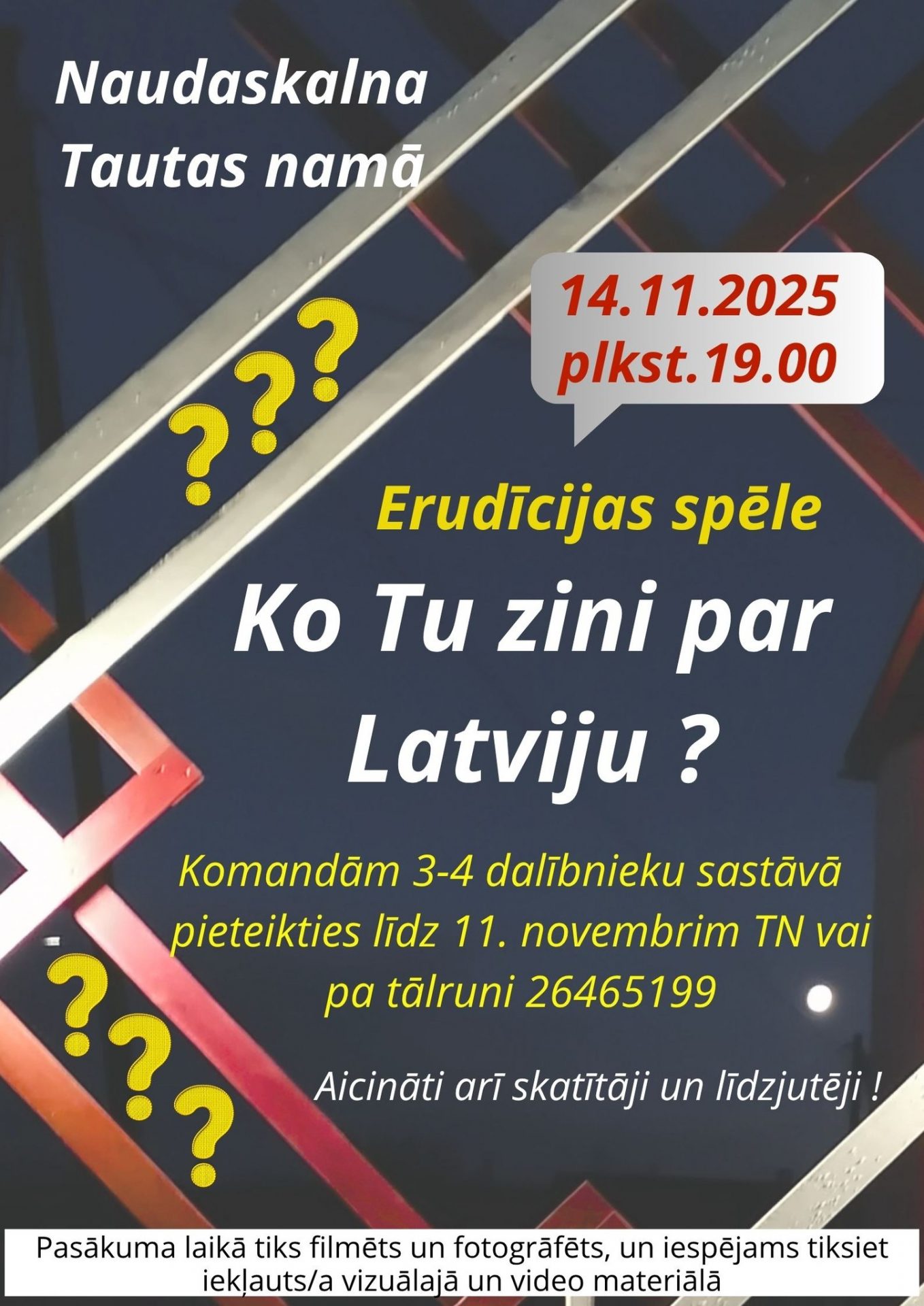 19:00 Erudīcijas spēle “Ko Tu zini par Latviju?” Naudaskalna Tautas namā. Komandu (3-4 pers.) pieteikšana līdz 11.11., zvanot 26465199.