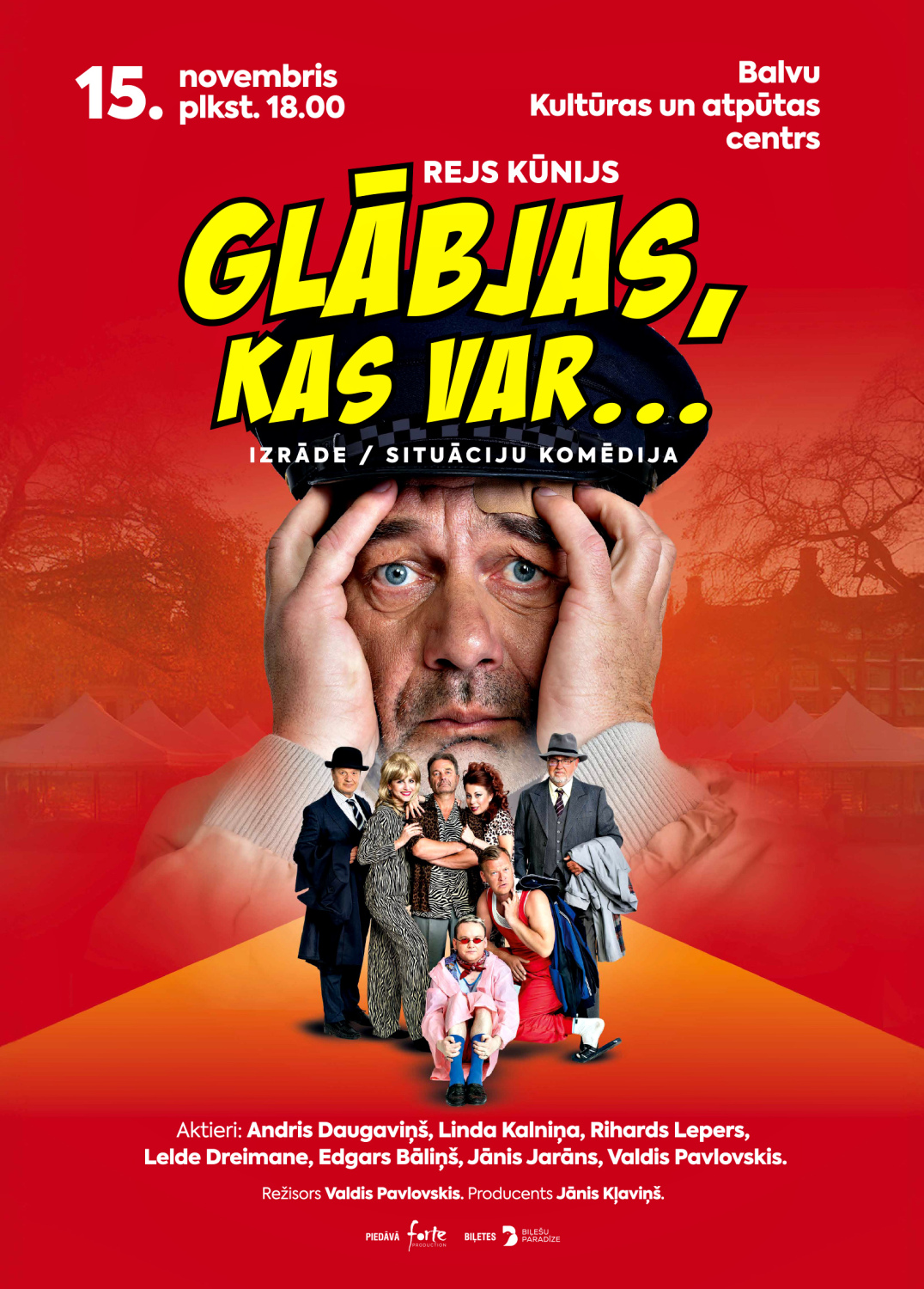 18:00 Izrāde-situāciju komēdija “Glābjas, kas var…” Balvu Kultūras un atpūtas centrā. Lomās Andris Daugaviņš, Linda Kalniņa, Rihards Lepers, Lelde Dreimane, Edgars Bāliņš, Jānis Jarāns, Valdis Pavlovskis. Biļetes: https://www.bilesuparadize.lv/lv/event/154791