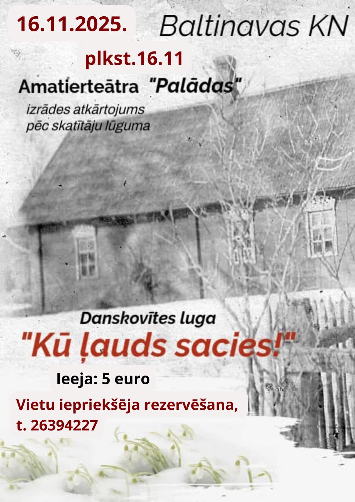 16:11  Amatierteātra ”Palādas” izrāde ”Kū ļauds sacies”, režisore Anita Ločmele, Baltinavas Kultūras namā. Ieejas maksa: 5 EUR. Vietu rezervēšana, zvanot 26394227 (Violenta).