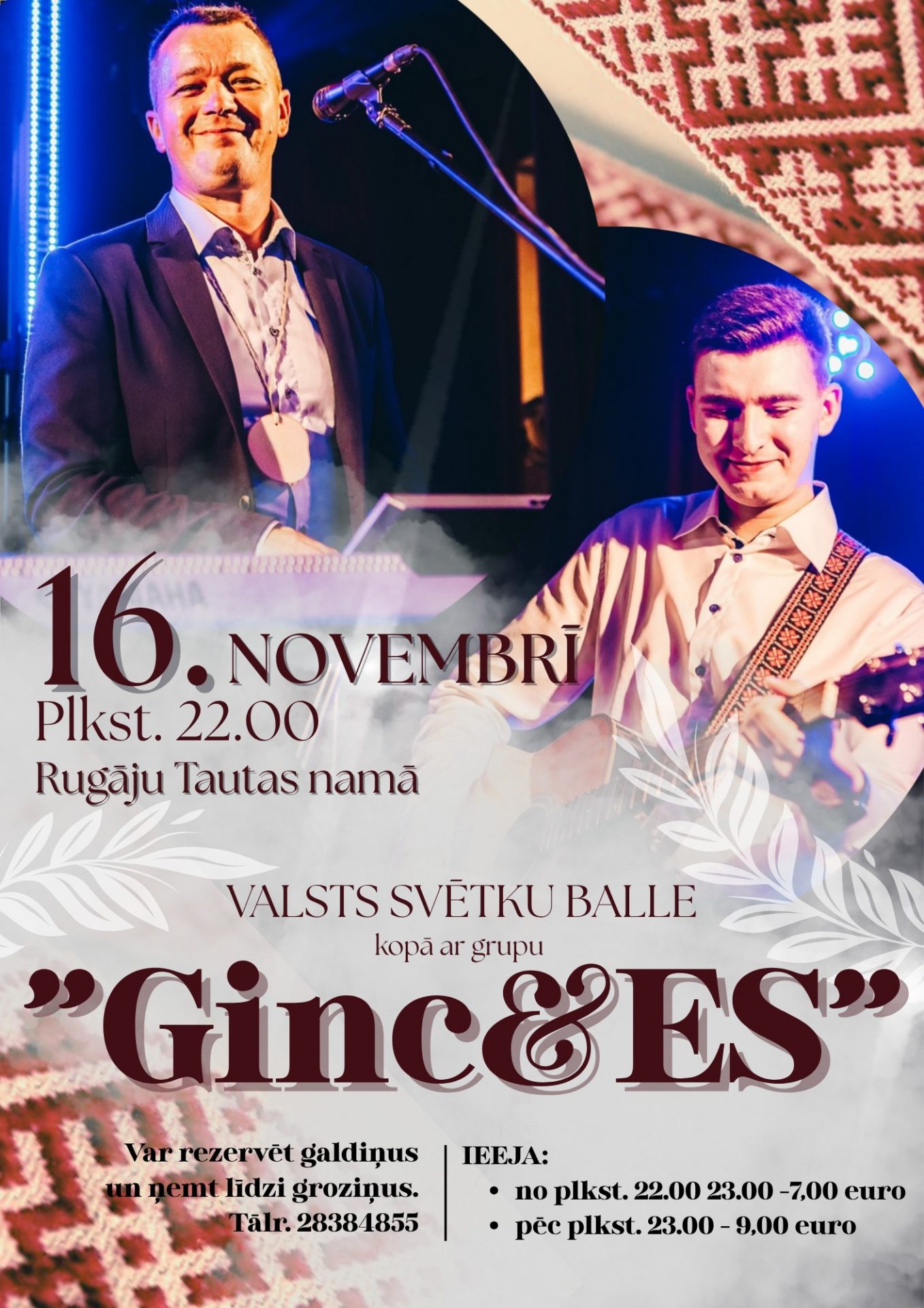 22:00 Svētku balle kopā ar grupu “Ginc&Es” Rugāju tautas namā. Galdiņu rezervācijām: 28384855. Ieejas maksa: 7 EUR, pēc 23:00 9 EUR