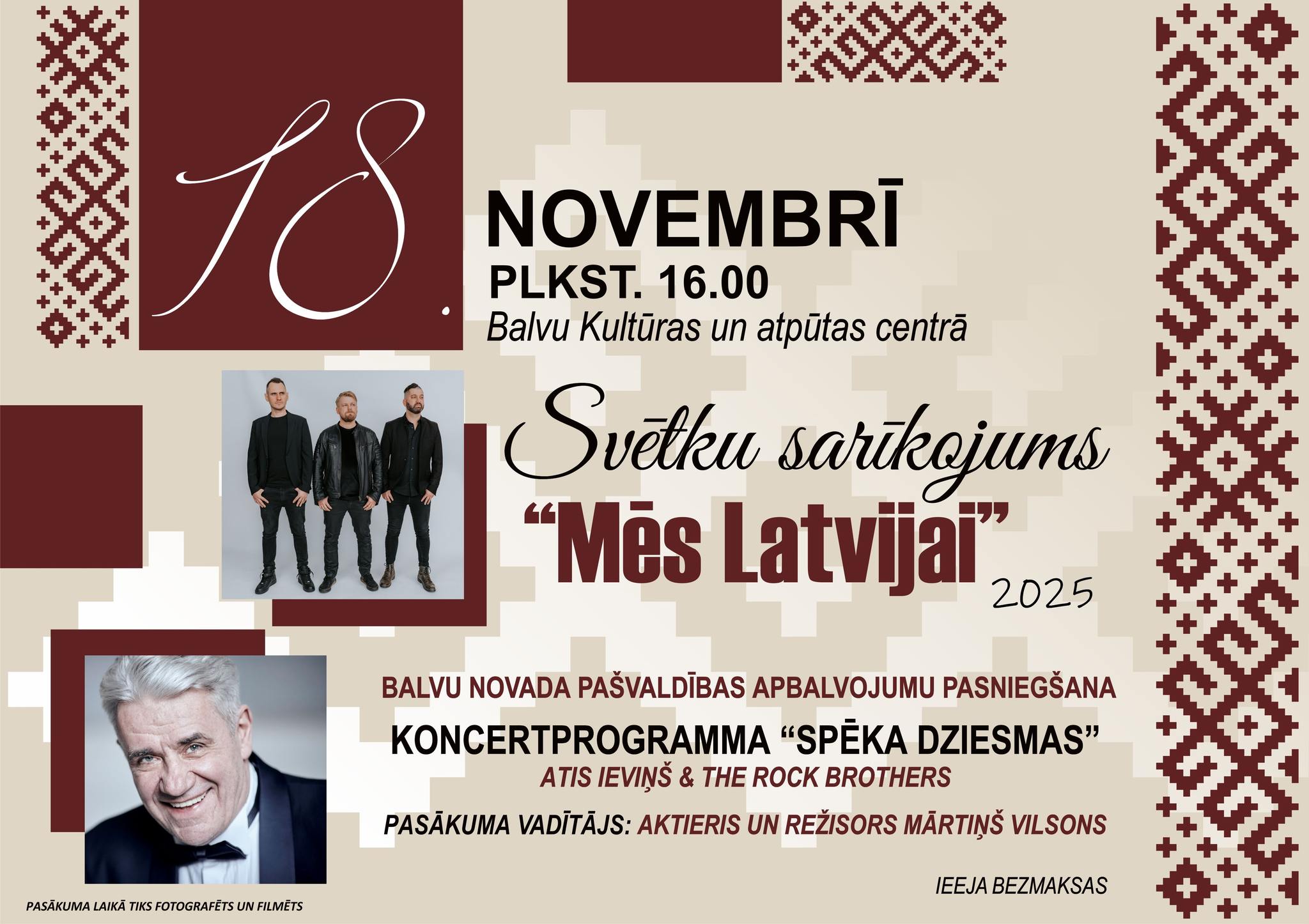 16:00 Svētku sarīkojums “Mēs Latvijai” Balvu Kultūras un atpūtas centrā – Balvu novada pašvaldības apbalvojumu pasniegšana, Ata Ieviņa un “The Rock brothers” koncertprogramma “Spēka dziesmas”. Pasākuma vadītājs – aktieris un režisors Mārtiņš Vilsons. Ieeja bezmaksas.