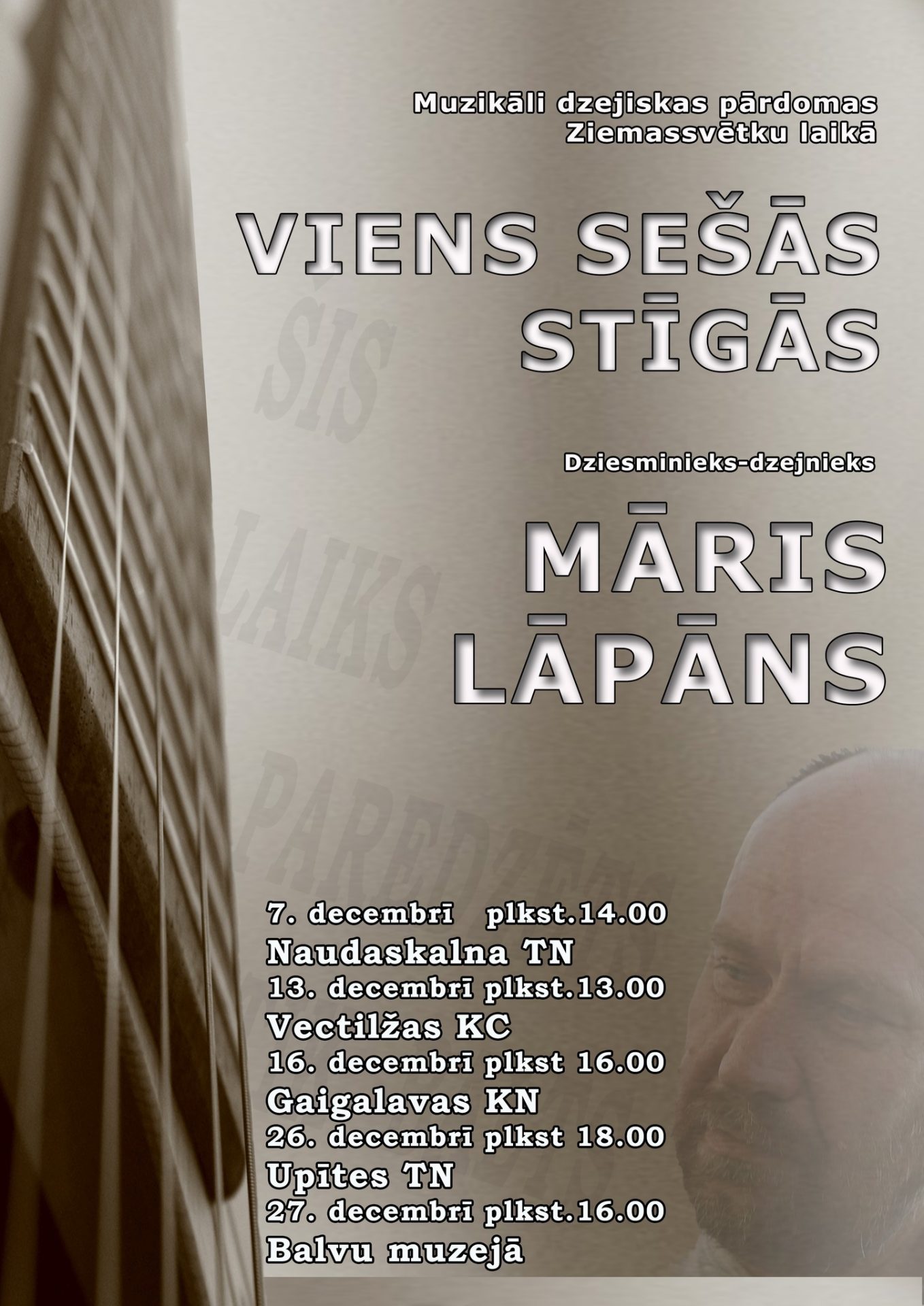 18:00 Muzikāli dzejiskas pārdomas Ziemassvētku laikā “Viens sešās stīgās”. Dzejnieks-dziesminieks Māris Lāpāns
