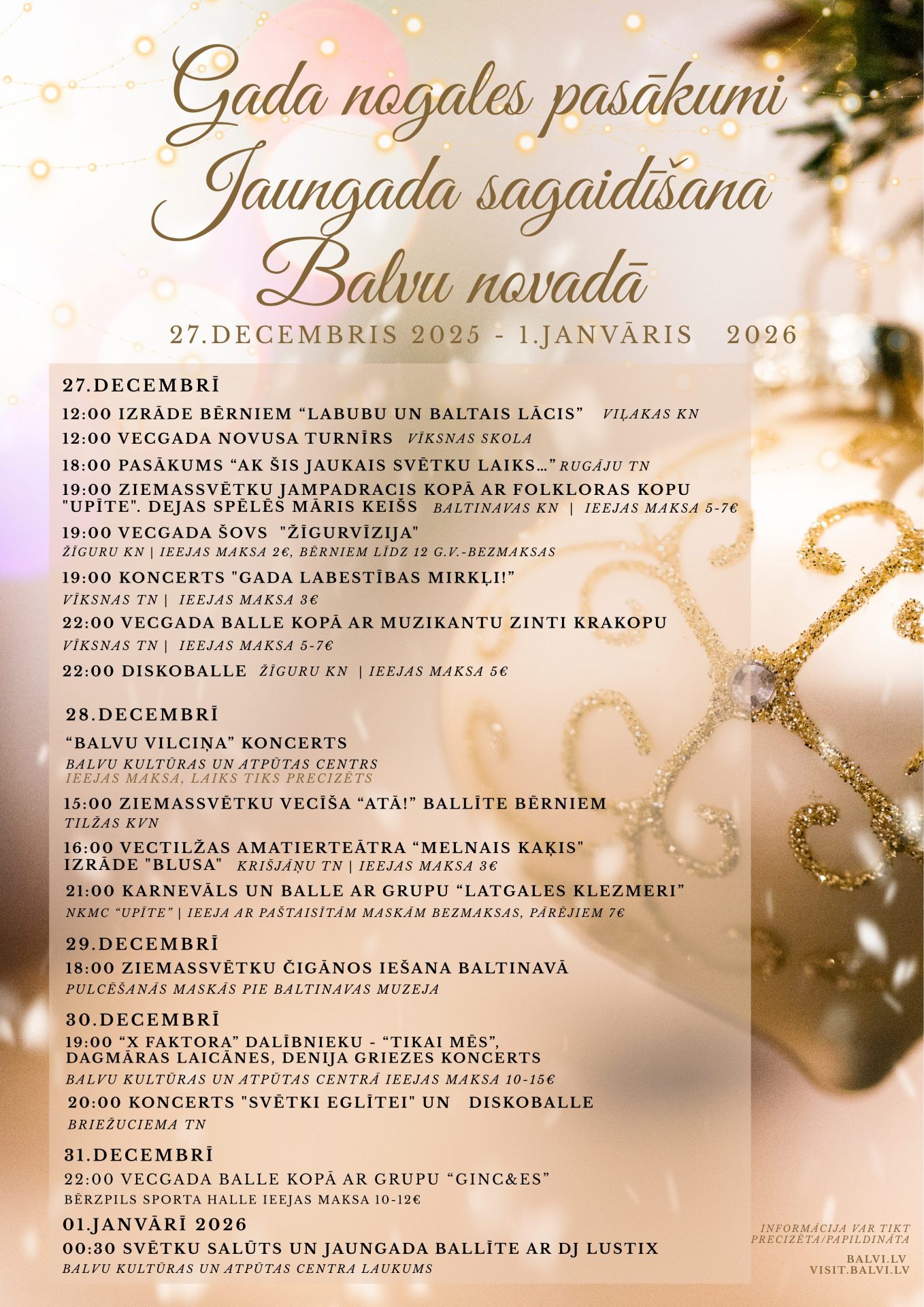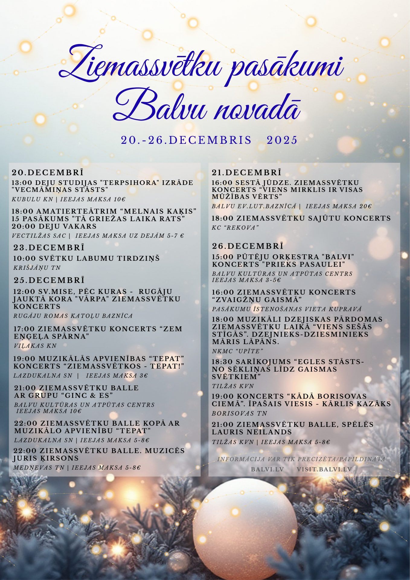 Gada sirsnīgāko svētku laikā aicinām apmeklēt koncertus un izrādes, svētku balles, kā arī izbaudīt maskošanos un citas svētku tradīcijas Balvu novadā.